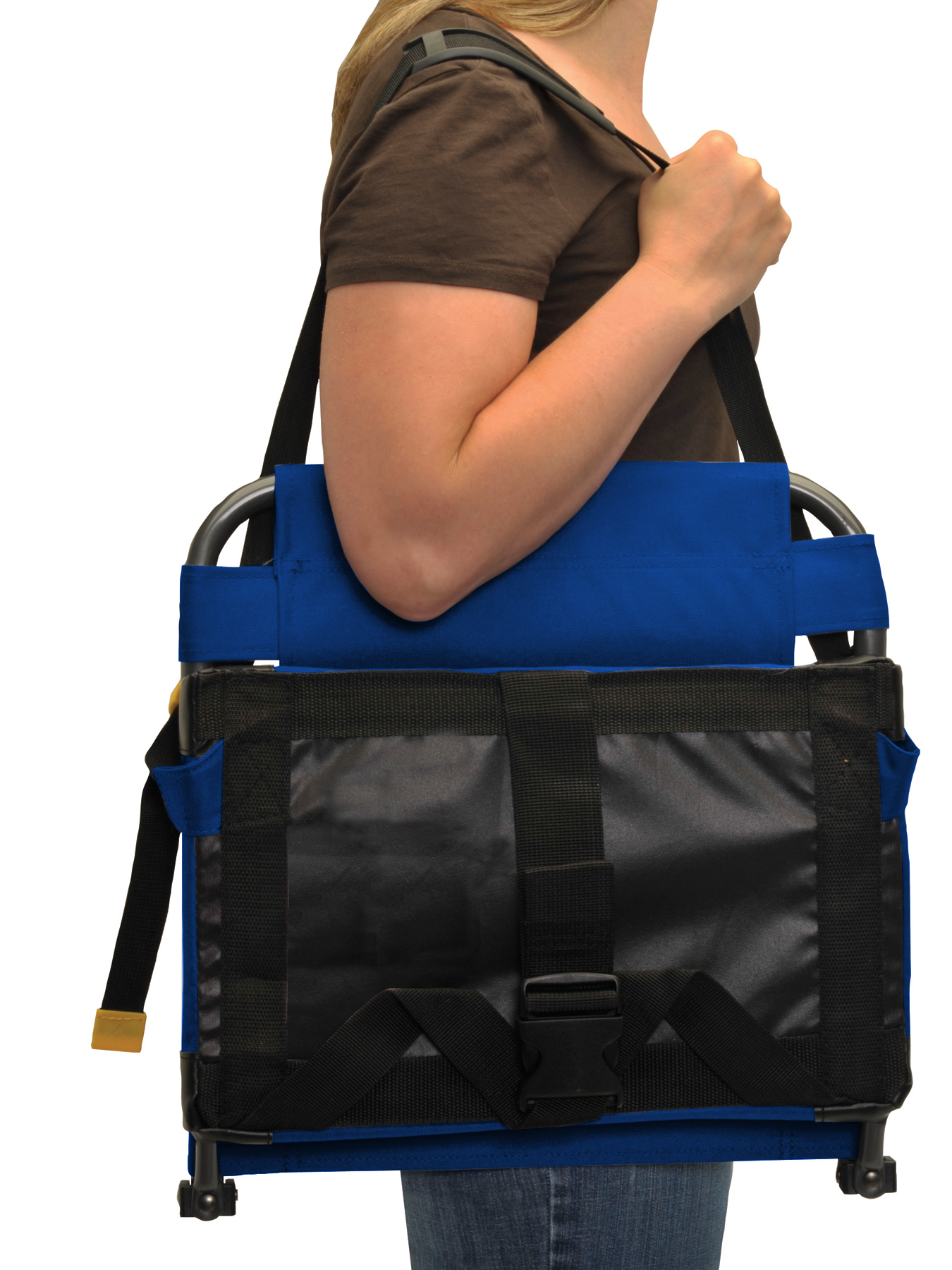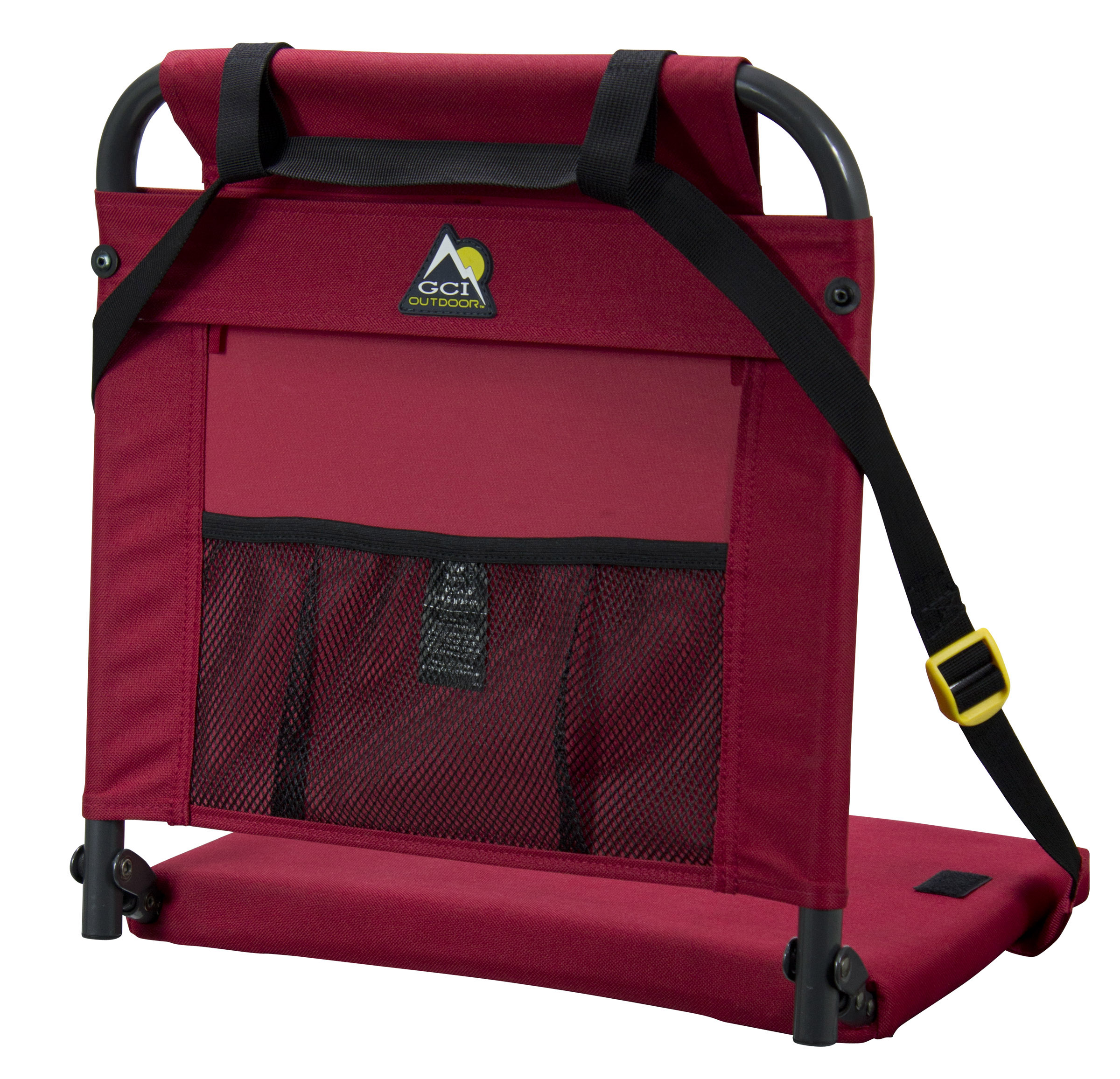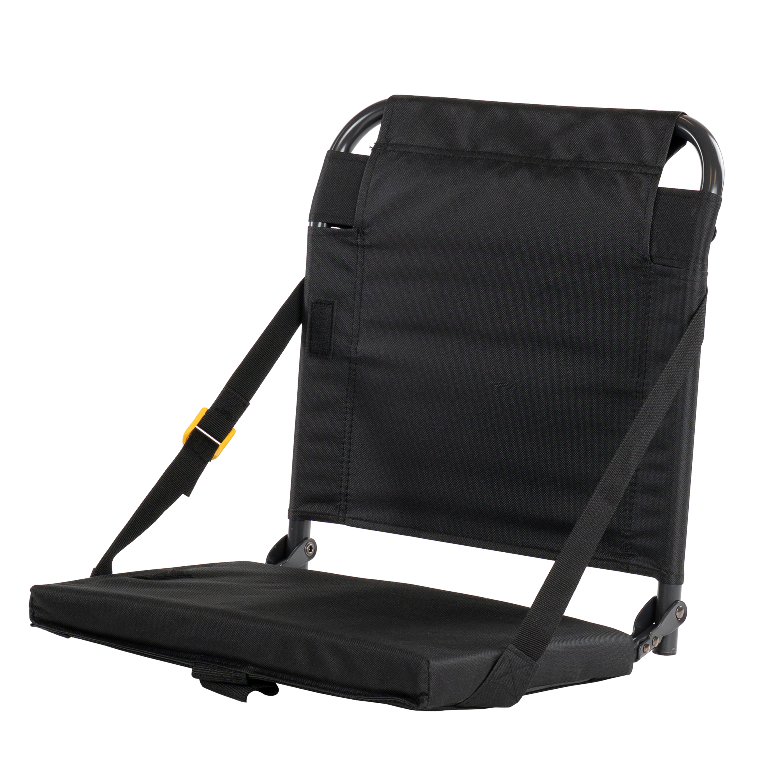 This stadium seat fastens to stadium benches with a click of a buckle. Features include a cushioned seat and storage pocket. Supports 250 lbs.